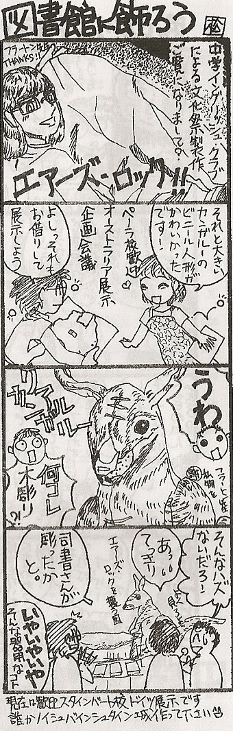 Well, the library at my school made a display for Australia just recently, and wanted to use the Ayers Rock and the Kangaroo, so of course I said yes. As advertising they drew a little cartoon in their newsletter to let the students know –